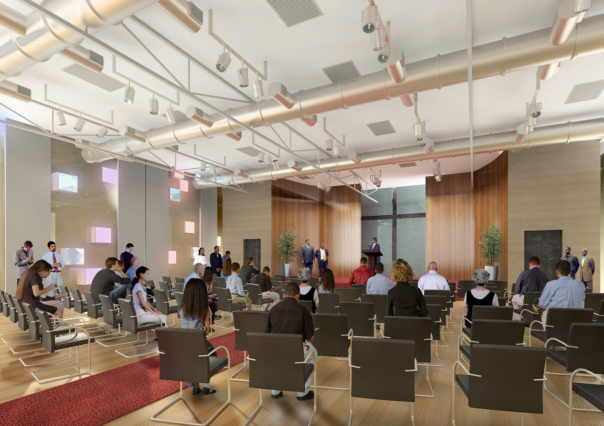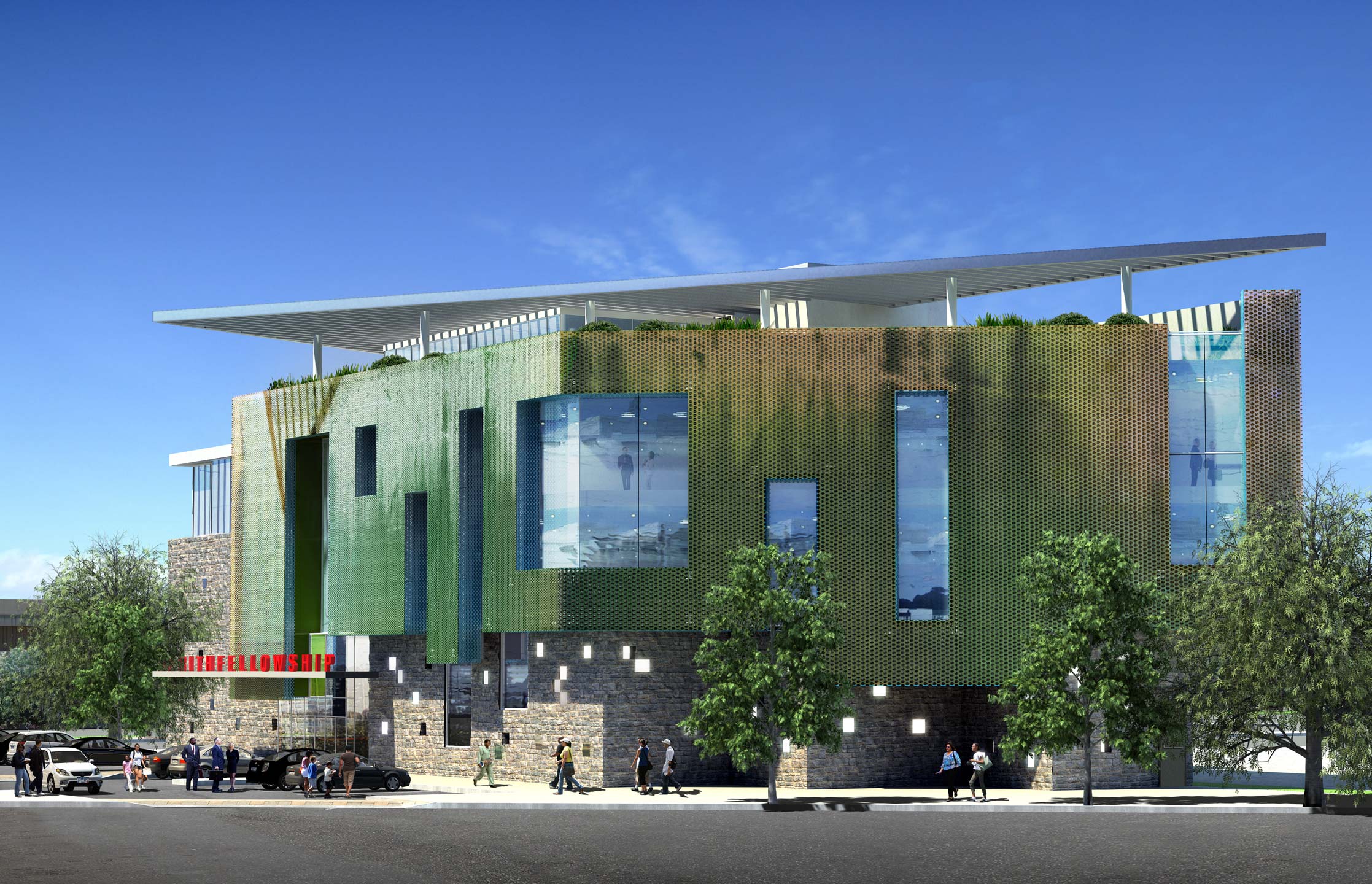 The Berith Fellowship Hall is set to be a new home for a non-traditional Christian congregation. The scope includes an assembly hall seating 320 as well as classrooms and administrative offices. Conceived as a lantern that shines at night, the building is composed of a strong base built of concrete masonry units draped with an exterior curtainwall clad in perforated copper skin. An outdoor gathering space is covered by a striking rooftop canopy and offers stunning views of the Bay.