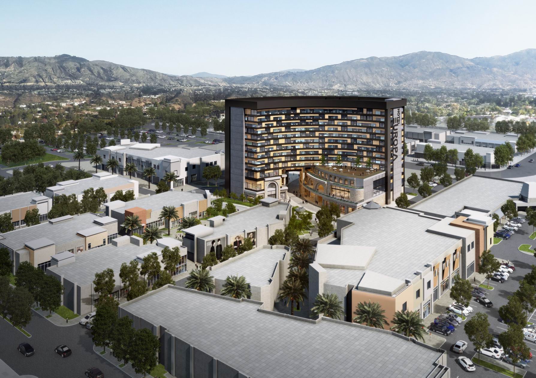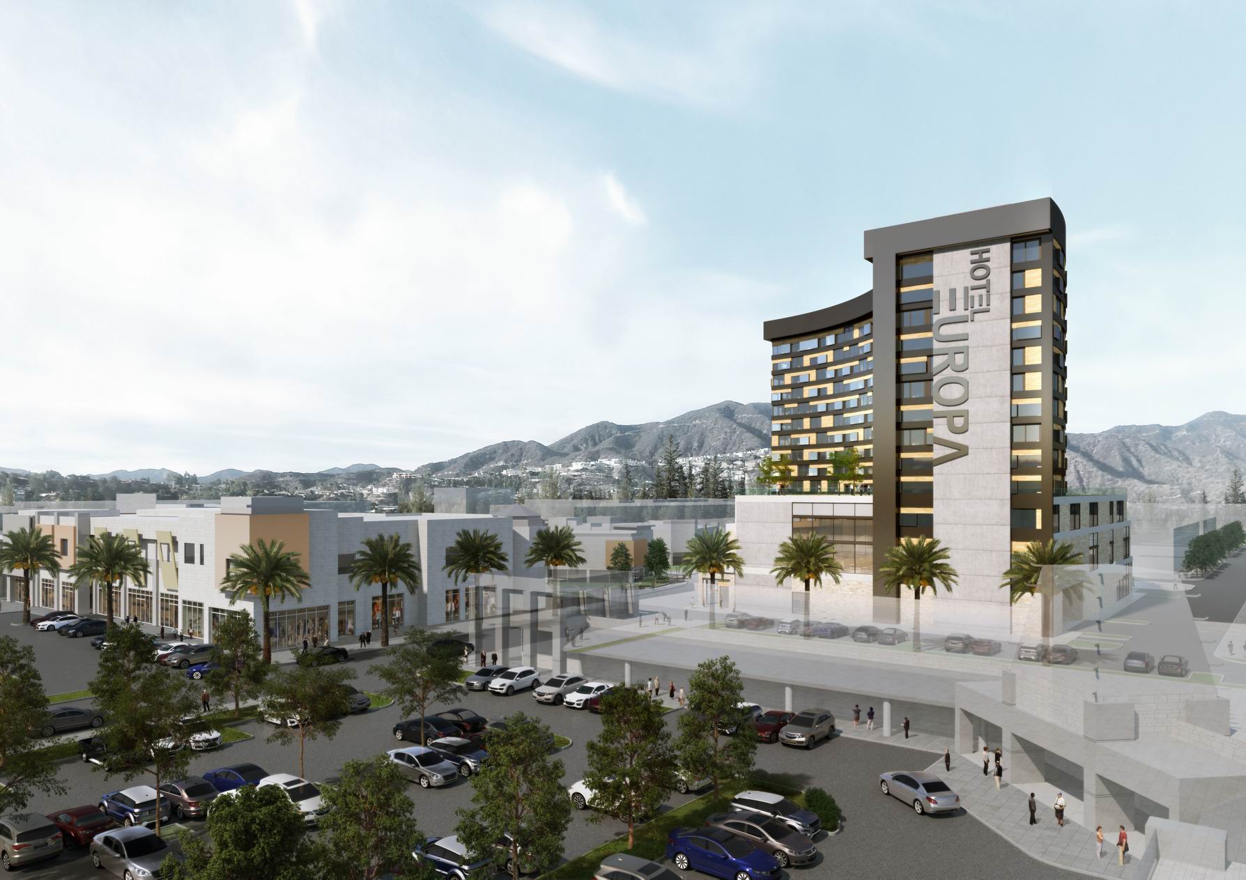 Europa Hotel is a 250-room hotel that will be the first high-rise building of its kind in Fremont, California. The curved form of the tower is mirrored on the ground floor by a curved avenue, cutting through the hotel volume to create a dynamic public space at the podium level and a drop-off loop for the hotel. The building podium combines the traditional and modern design languages of Europe into a new, exciting development in the growing city of Fremont. A physical interface is created by the avenue cut at the podium between the hotel and adjacent retail complexes of the India Village and The Heart, drawing the crowd into the activated plaza.